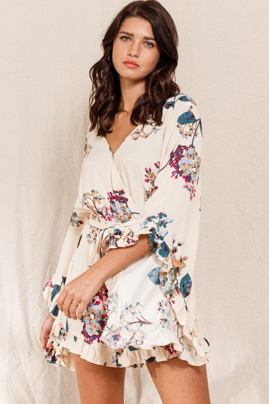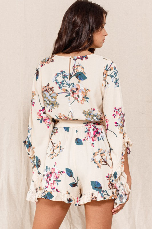 Floral printed v-neck romper featuring 3/4 length bell sleeves, self waist-band and ruffle hem details.