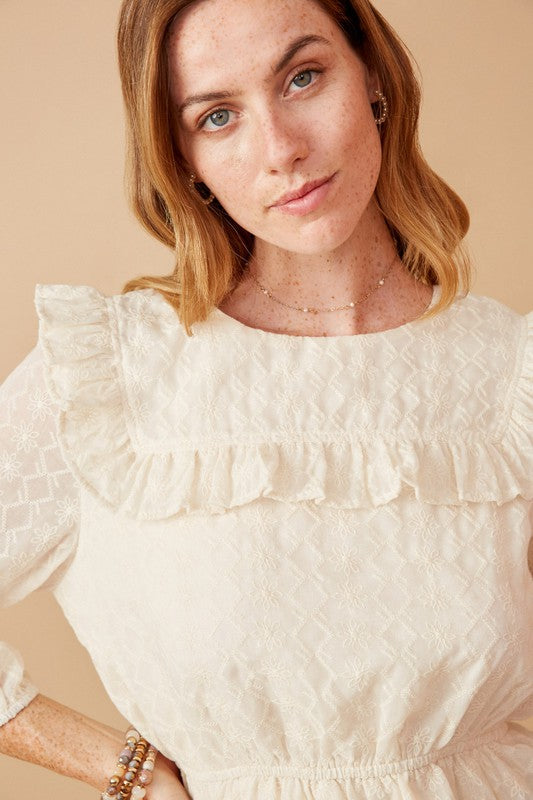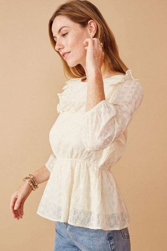 This women's ruffled yolk peplum top features delicate floral embroidery on woven fabric, offering a charming and feminine look. The square cut neckline adds a flattering touch, while the top lining ensures comfort and quality. Perfect for adding a stylish, supportive layer to your wardrobe.