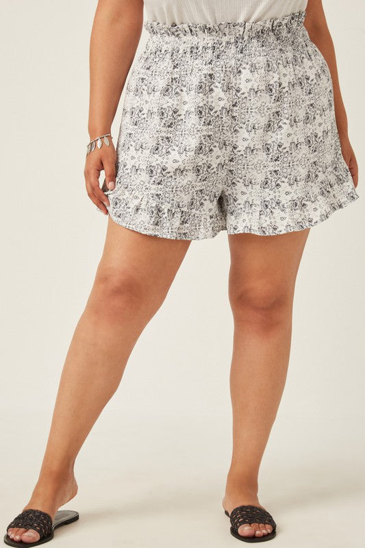 These Printed Ruffled Shorts feature a comfortable smocked waist that ensures a perfect fit and a flattering silhouette. Made from lightweight woven fabric, they offer breathability and ease of movement. The delicate ruffle hemline adds a feminine touch, making them ideal for casual outings or relaxed summer days.