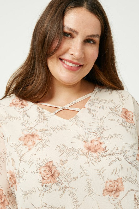 Elevate your wardrobe with this Strappy Balloon Sleeve Top, featuring a delicate floral semi-sheer fabric that adds a touch of romance. The cross strap V-cut neckline beautifully frames your décolletage, while the fully lined design ensures comfort and coverage. Perfect for both casual outings and special occasions, this top combines feminine elegance with modern style effortlessly.