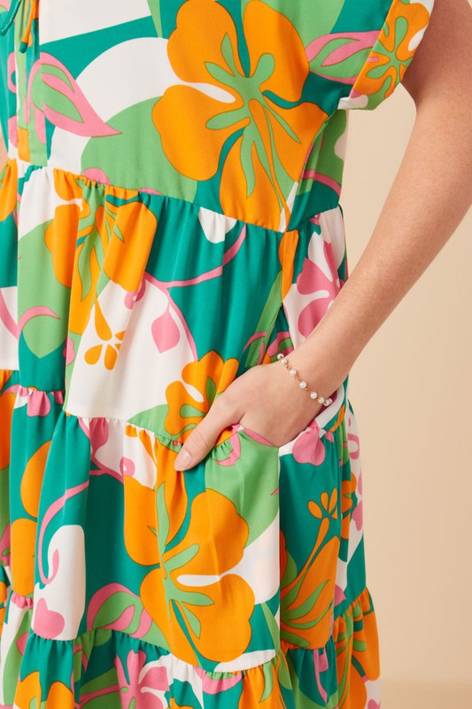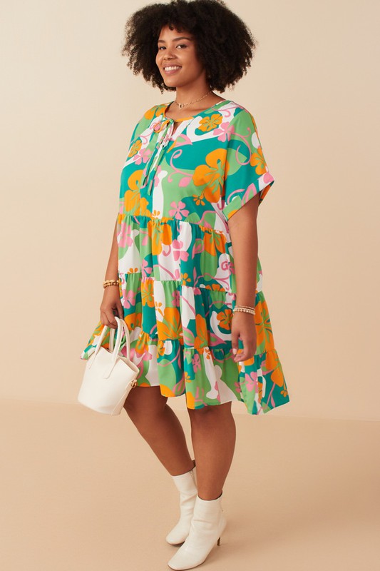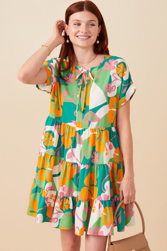 Embrace sunny days in this Vibrant Floral Tiered Dress, featuring a lively floral print that brightens any occasion. The playful tie detail adds a flirty touch, while dolman sleeves offer effortless comfort and style. Perfect for twirling through warm afternoons or casual outings with friends.