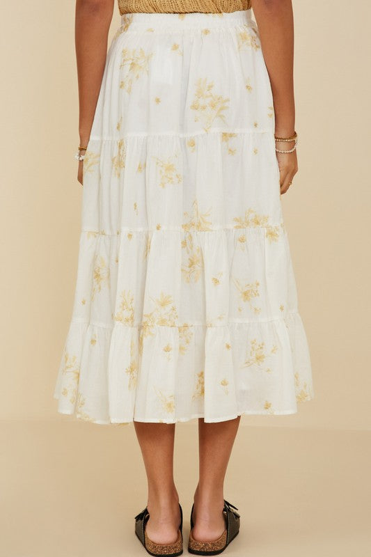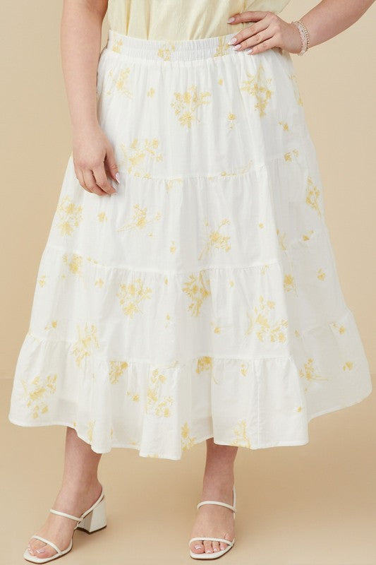 This women's skirt features delicate floral embroidery on soft fabric, offering a charming and feminine look. The elastic waistband ensures a comfortable, flexible fit, while the tiered design adds graceful movement and subtle volume. Perfect for everyday wear or special occasions, this skirt combines style and comfort effortlessly.