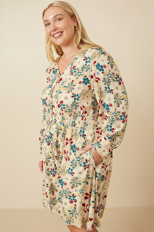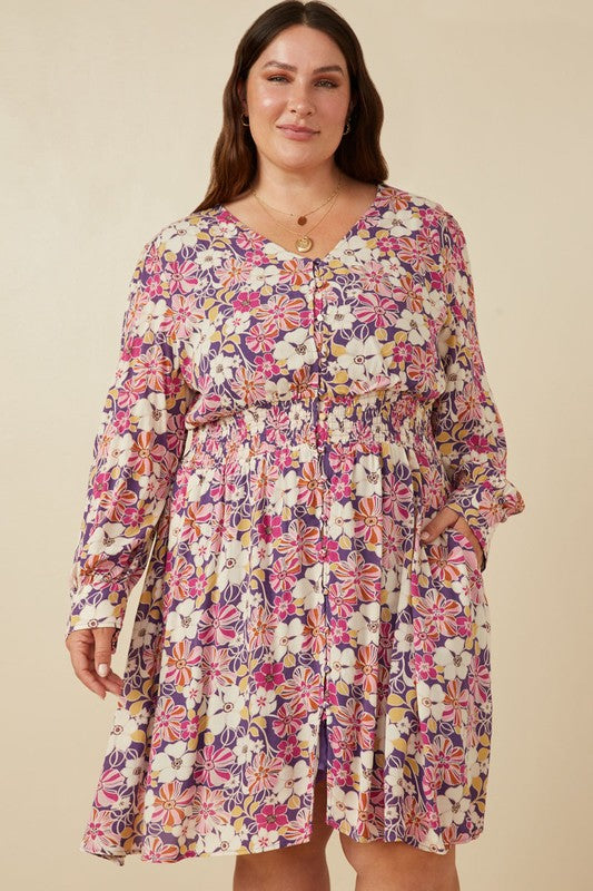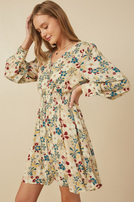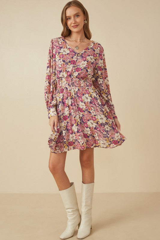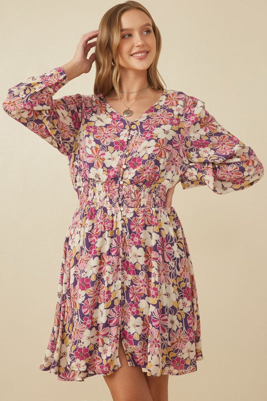 This playful Floral V Neck Dress features a charming floral print that brightens any day. The front button closure adds a touch of classic style, while the smock detail creates a flattering, comfortable fit. Perfect for sunny outings or casual gatherings, this dress combines fun and feminine flair effortlessly.