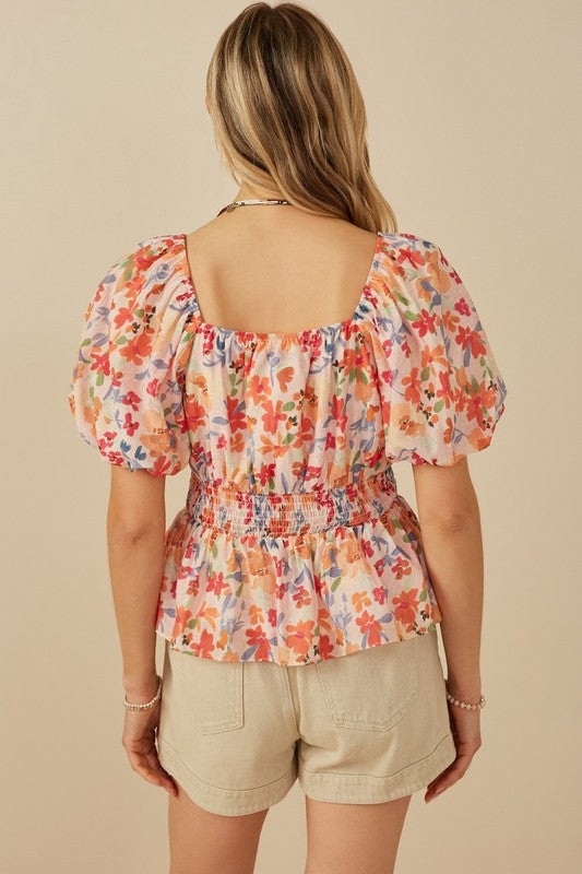 Embrace bold femininity with this Paneled Puff Sleeve Top, featuring a vibrant floral print that commands attention. The smocked detailing enhances your silhouette, while the dramatic puff sleeves add a daring, fashion-forward edge. Perfect for making a statement wherever you go.
