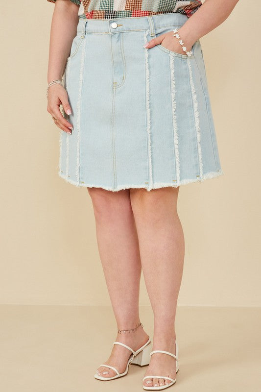 This playful denim skirt features trendy frayed seams that add a touch of edge to your outfit. Crafted from durable denim fabric, it offers a comfortable fit with a classic front button closure. Practical back pockets complete the look, making it perfect for casual days with a fun, flirty vibe.
