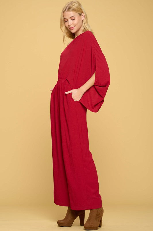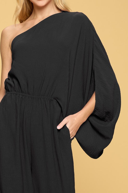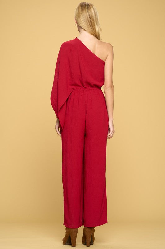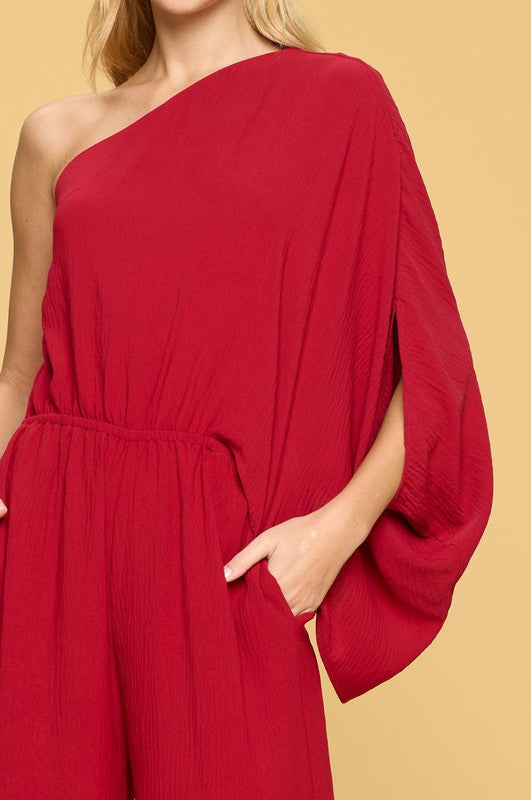 Solid woven one shoulder jumpsuit featuring an one-shoulder neckline, side pockets, kimono sleeves and waist band.